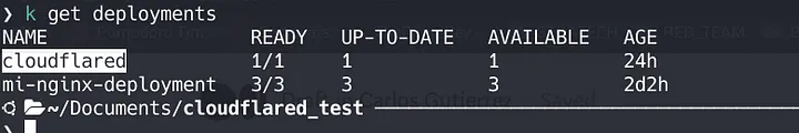 Run kubectl get deployments, after this check zero trust dashboard > tunnels section, your tunnel should be on active state (as today, there’s a bug in cf, showing degraded state in the dashboard, if you get that your tunnel should be okay).
