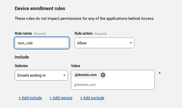 Add a new rule, in this example I will allow my @domain users to enroll devices in our organization warp client.