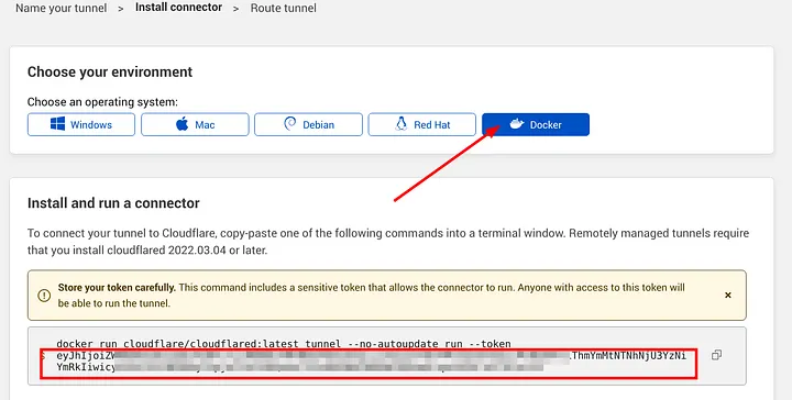 Here, select docker as environment and save the auto generated token, this token will be used to authenticate the cloudflared deployment in k8s to establish a connection backwards with the tunnel. (Remember to send this token as a kubernetes secret).