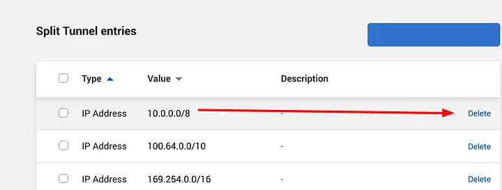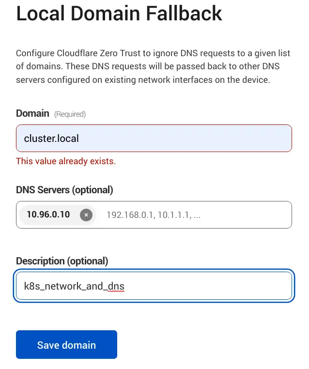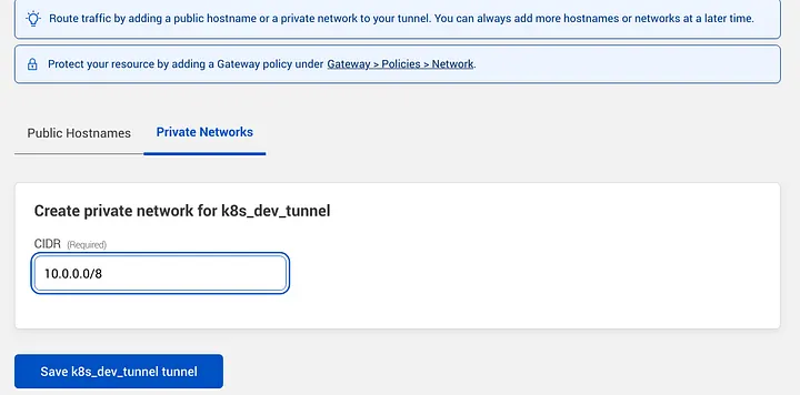 Here, we must delete the network range we want to reach, this action will make cloudflare send queries to this network 10.0.0.0/8 and will allow to be resolved remotely, this way we will be able to reach our private k8s network.