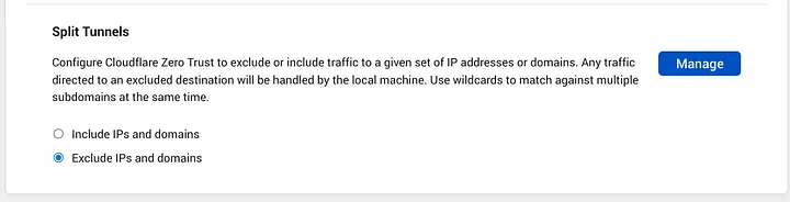 Now, go to Settings > warp client > Device Settings > Default Profile > Split Tunnels, should be set on “Exclude IPs and domains”, then click on Manage.