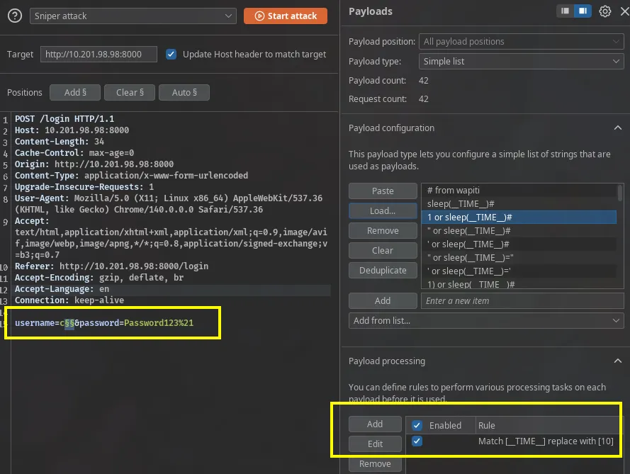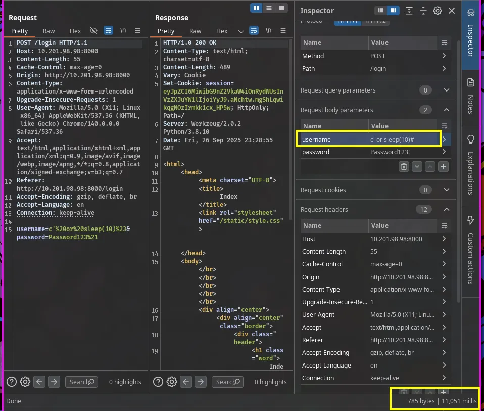 Blind SQLi confirmed: The response delays by 10 seconds.