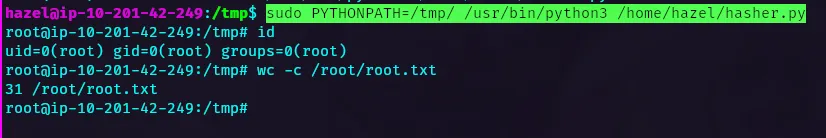 sudo PYTHONPATH=/tmp/ /usr/bin/python3 /home/hazel/hasher.py
